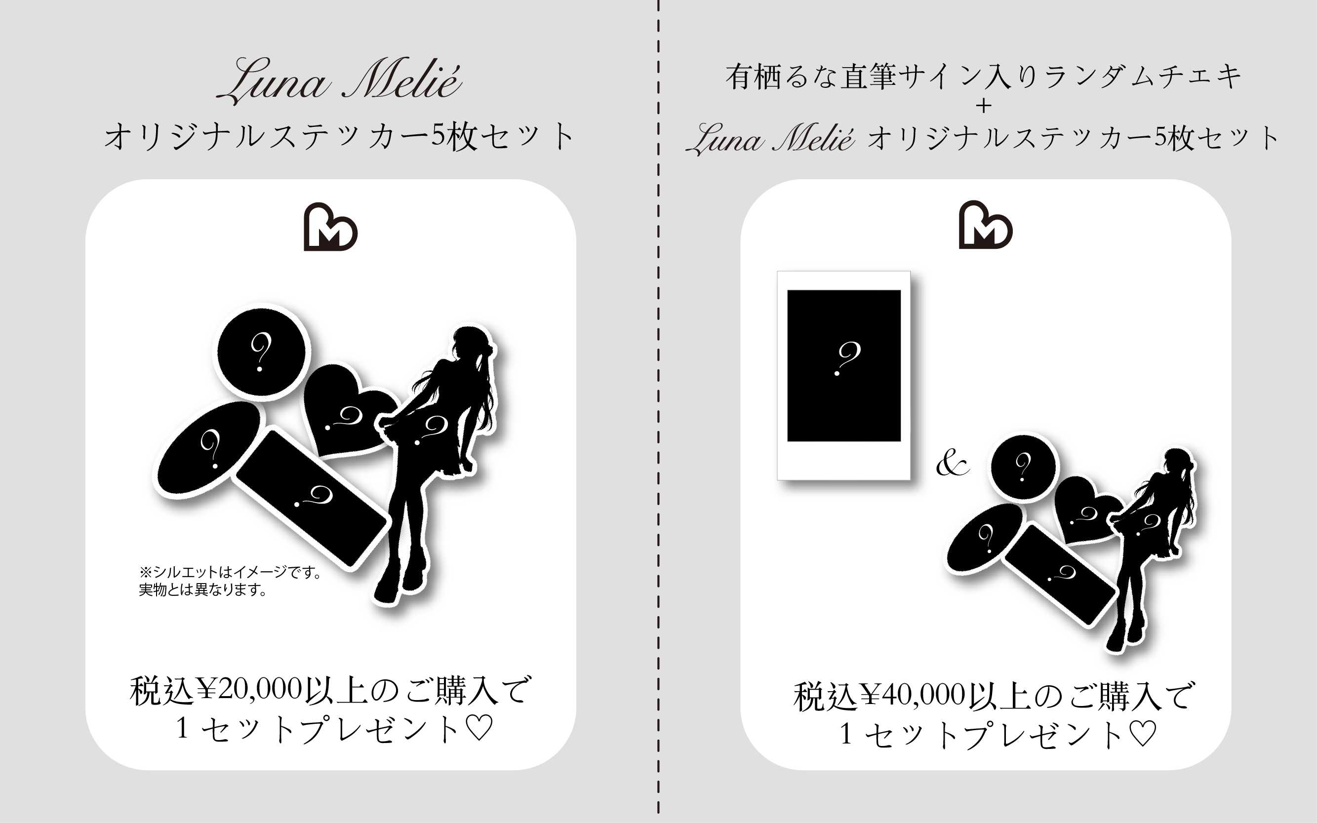 上記の受注期間内にLuna Melié の商品を税込¥20,000以上ご購入のお客さまに、Luna Melié ステッカー5枚setをプレゼント♡!