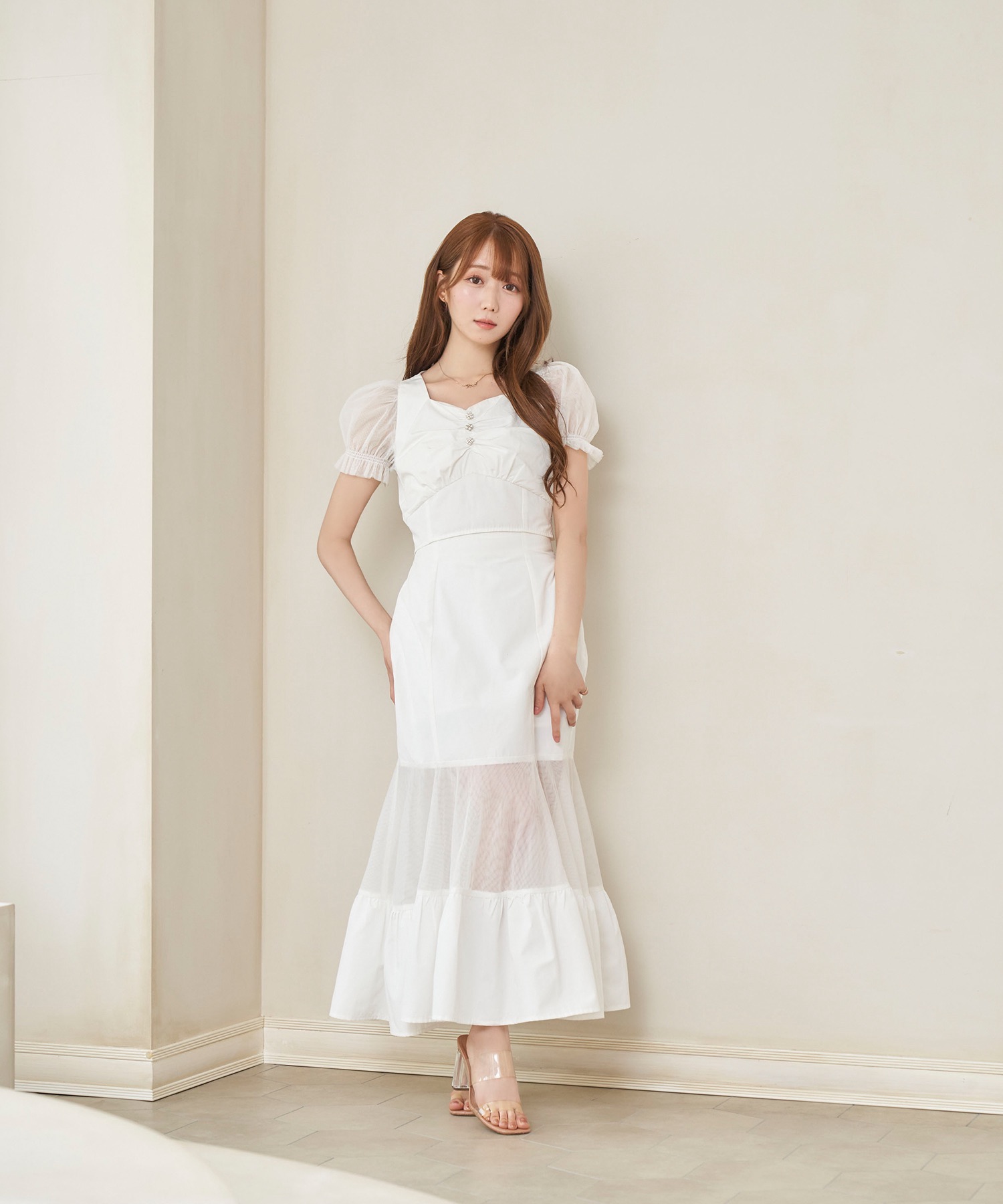 胸元につけたビジューボタンがアクセントになるとっておきの1枚です。