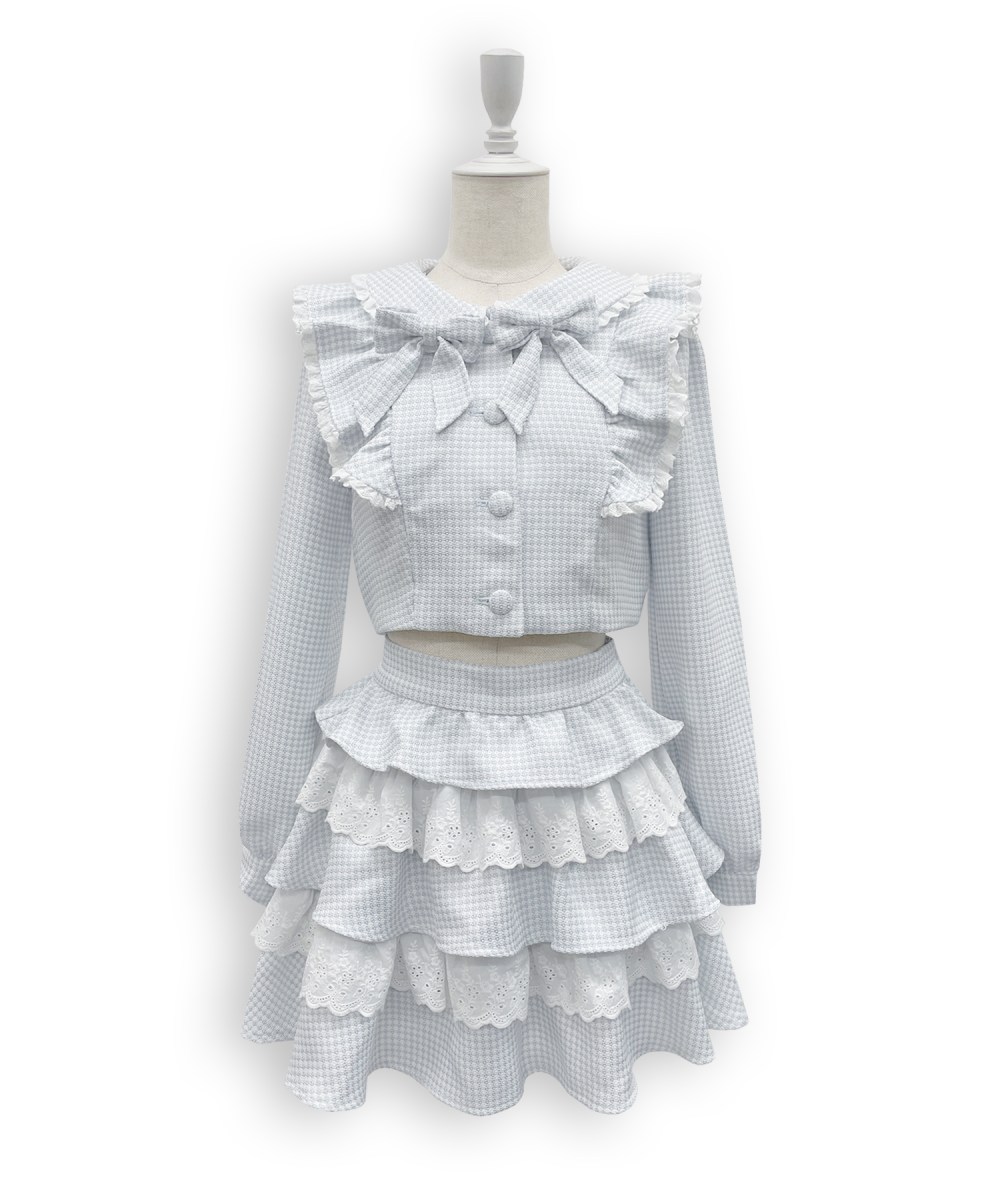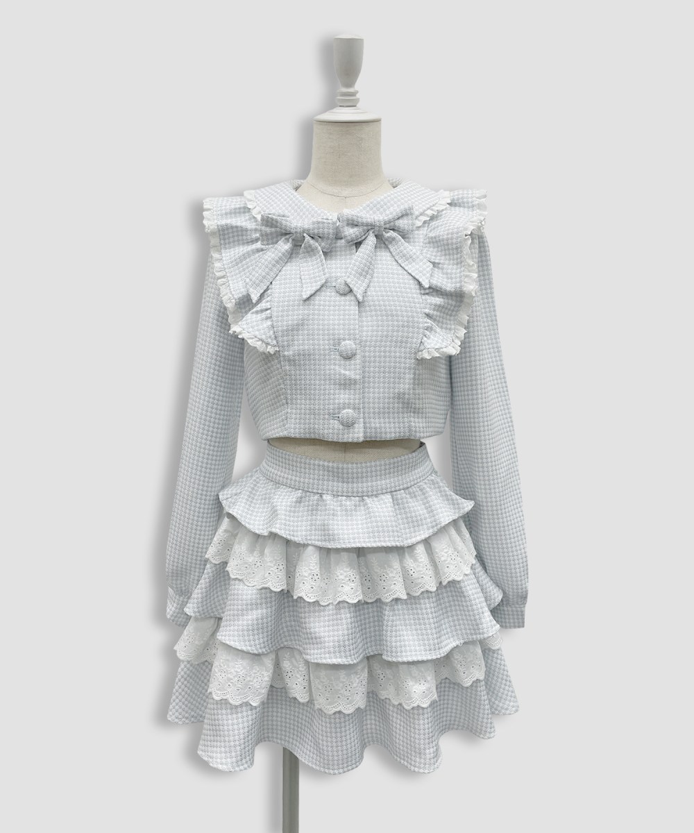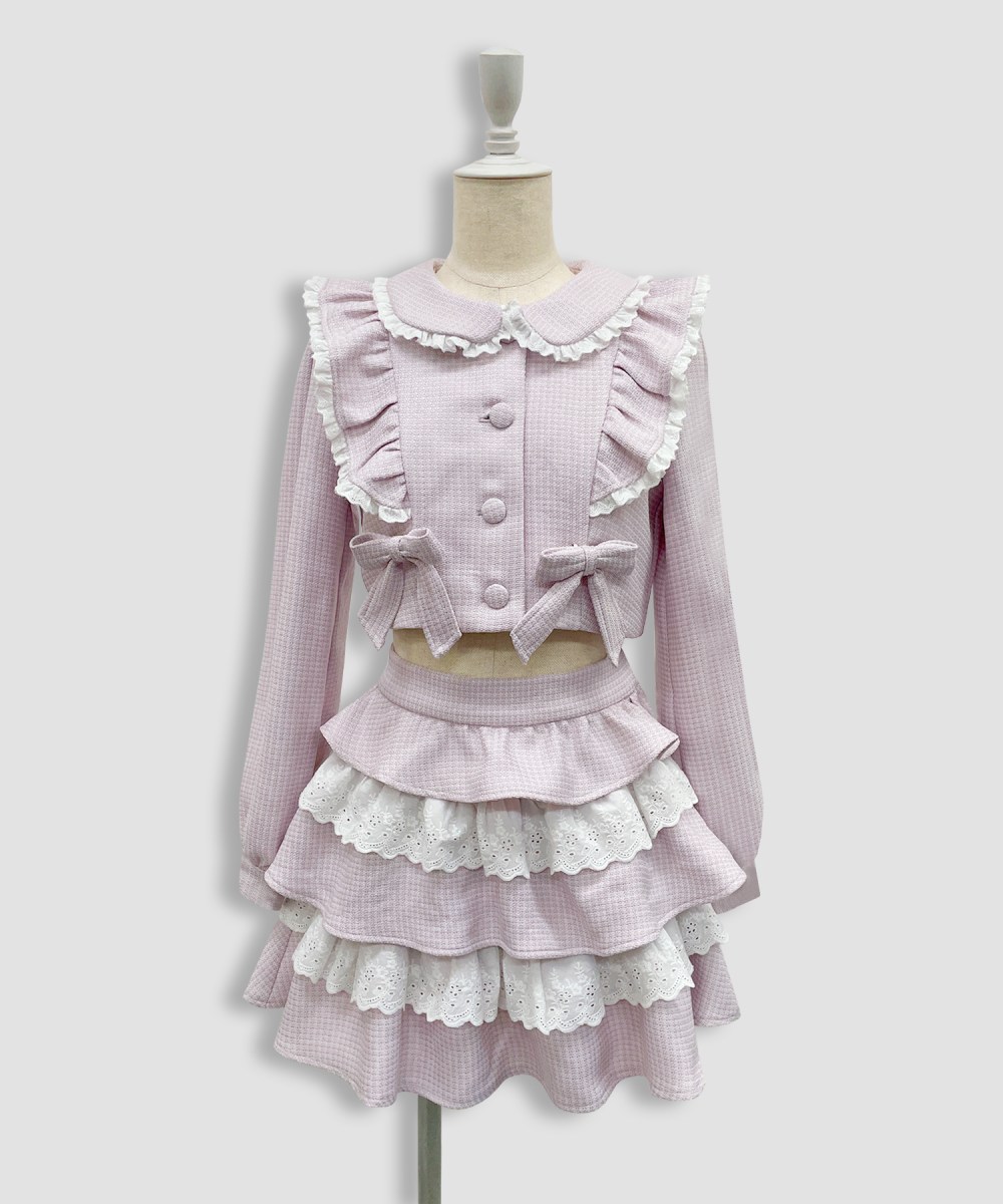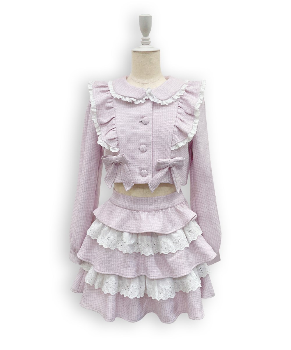 ツイードとレースの重なりでボリューム感のあるスカートはインナーパンツ付きなので短い丈でも安心してお使いいただけます◎