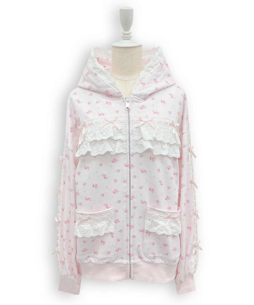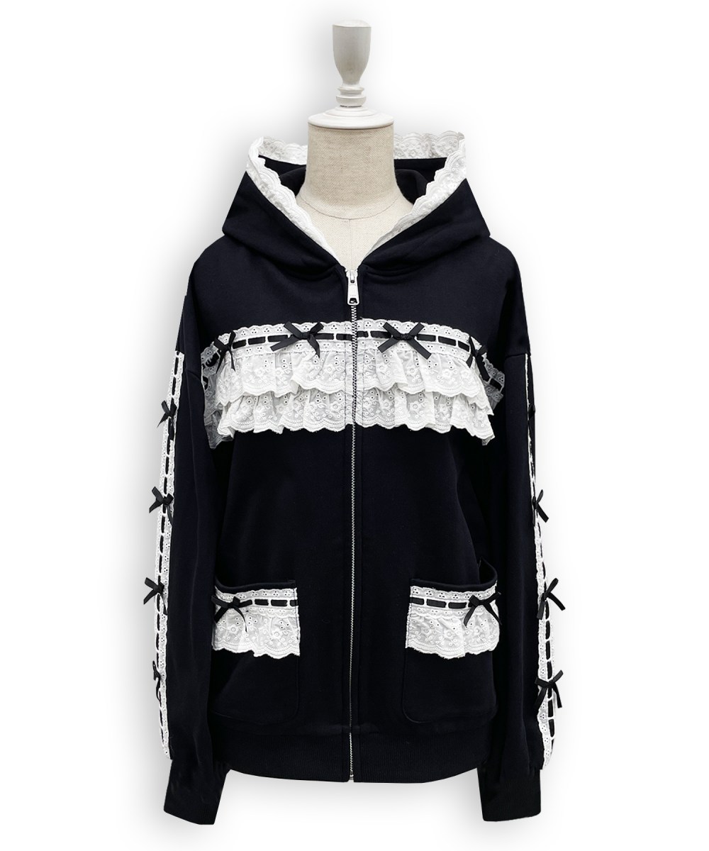 たっぷりのコットンレースと細部のリボンでガーリーな気分を高めるジップパーカー♡