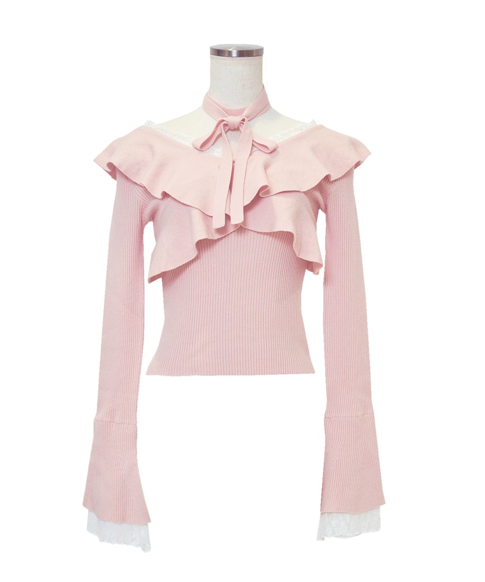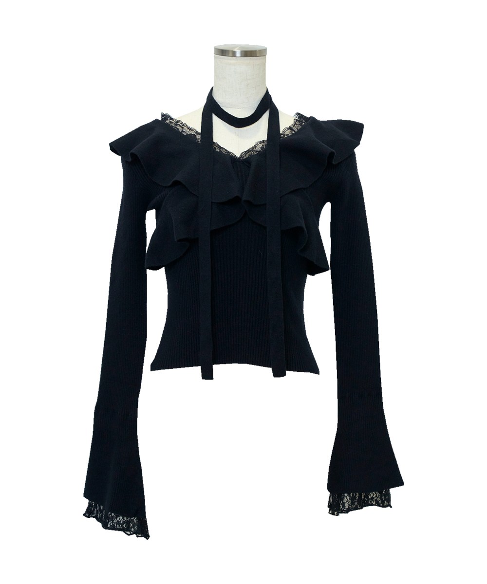 たっぷりのフリルでボディを華やかに見せてくれるニットトップス。 デコルテや袖に施したレースが女性らしさを演出してくれるアイテムです。 細めのタイは結び方でも印象が変わるので様々なコーディネートで楽しんでいただけます。