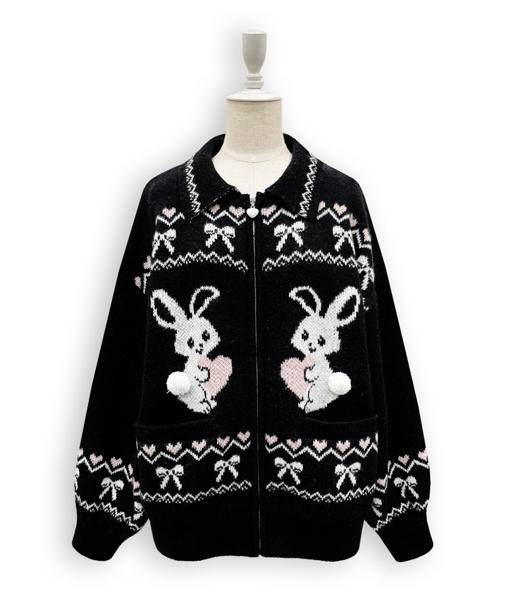 ❤︎大好評につき再入荷❤︎ かわいいモチーフの柄が目をひくフルジップニット♡ うさぎのしっぽがぽんぽんになっているのも愛らしいポイントです♪ ジップタイプなので着回しの幅が広がり長く着ていただけます◎