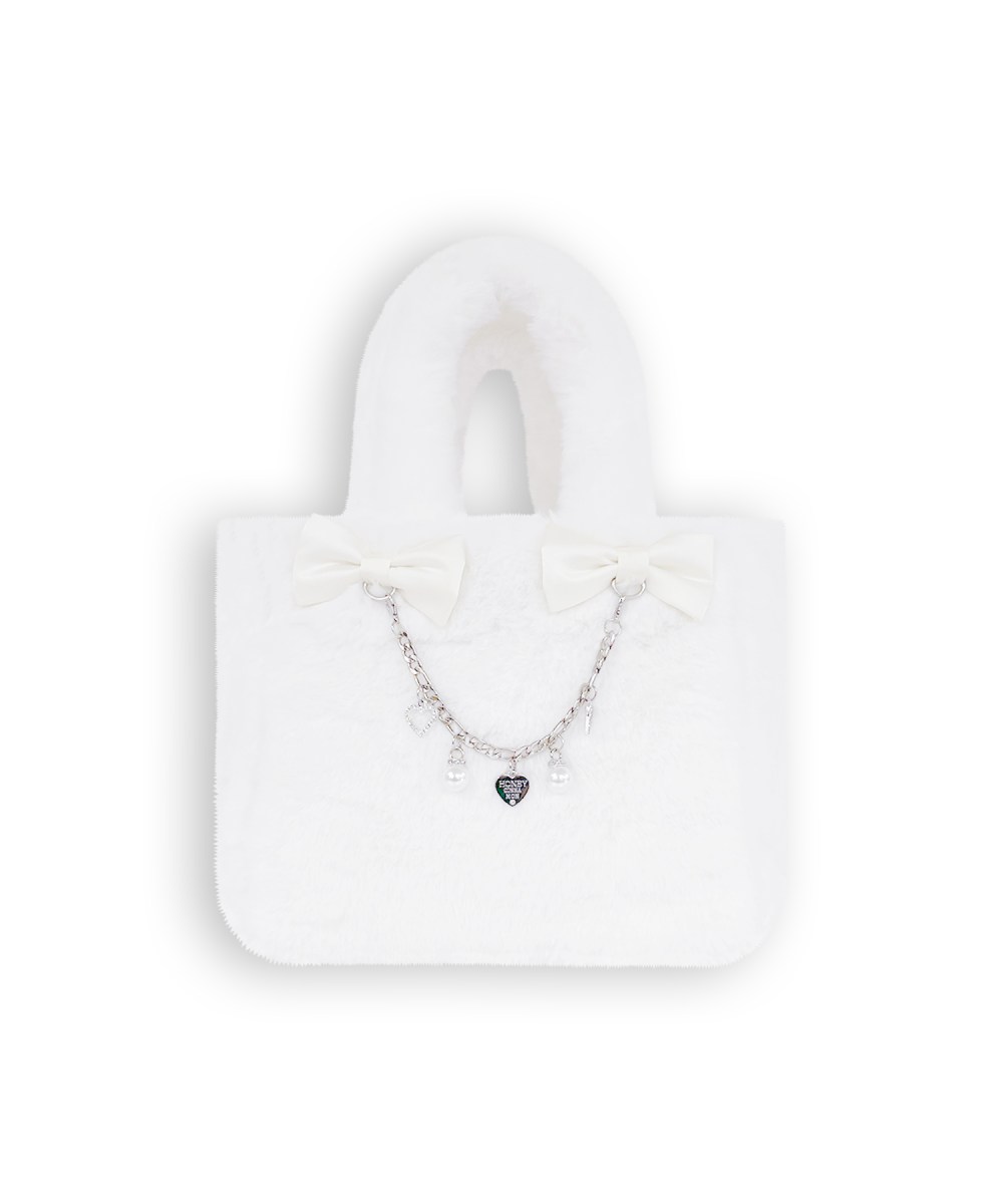 寒い時期の気分を高めてくれるエコファーを使用したトートバッグ♡ フロントにリボンとチャームをつけ可愛らしさ溢れるアイテムです♪ チャームは取り外しができるので気分やコーディネートにあわせて自由に楽しんでいただけます◎