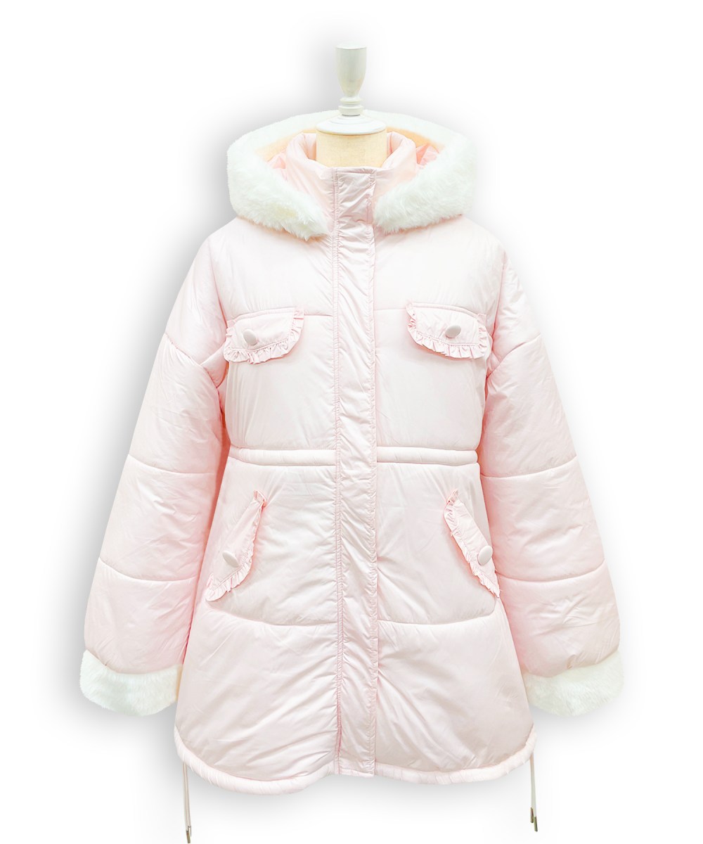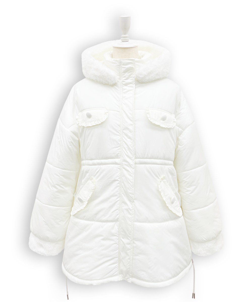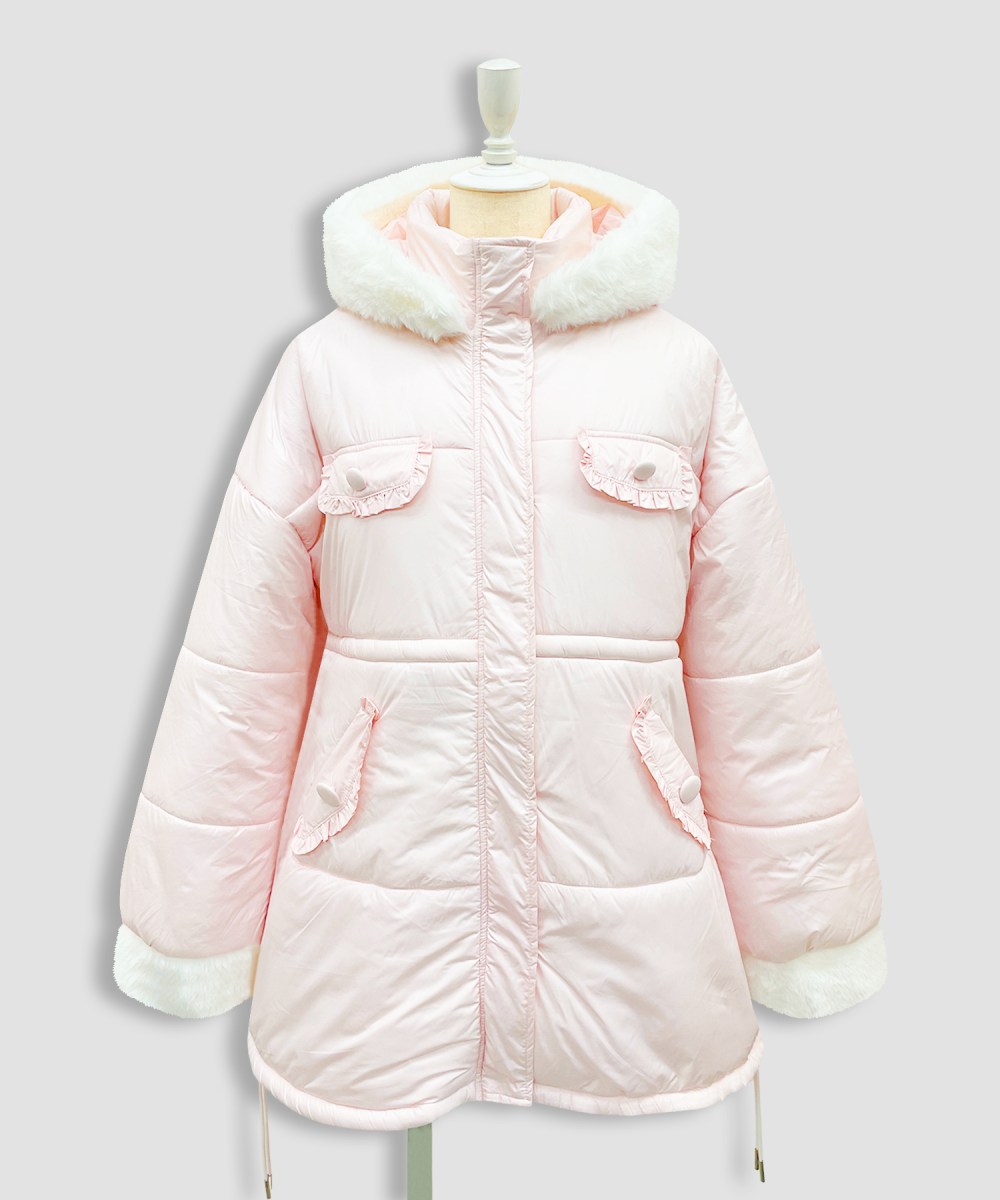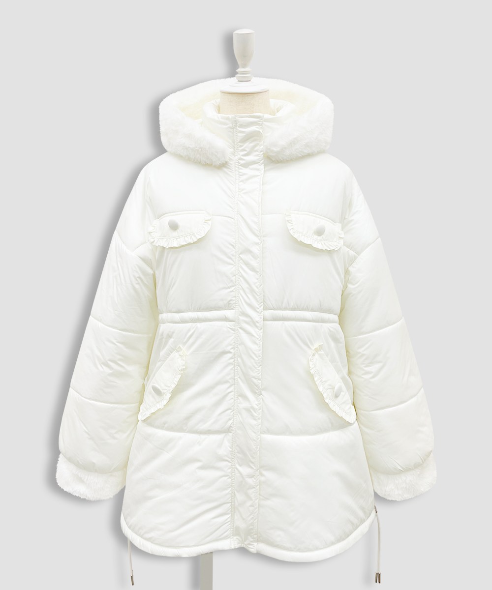 ポイントにファーを使用しガーリーさをプラスした中綿フードジャケット♪