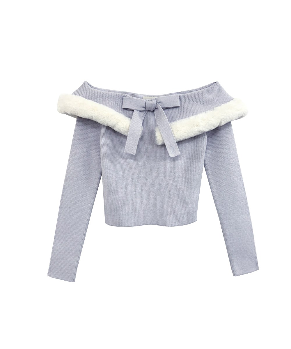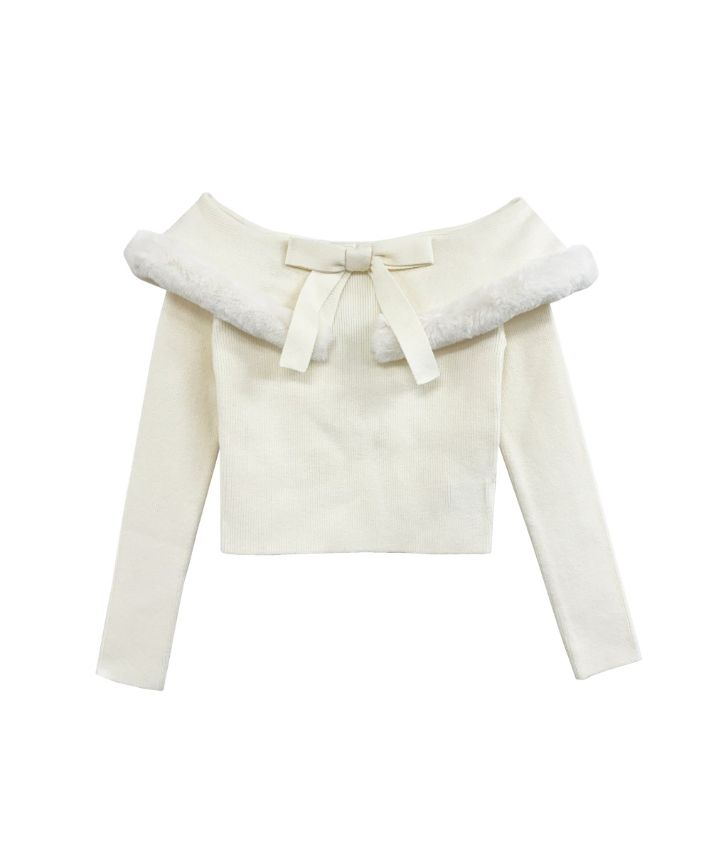 ふんわりとしたファーをあしらったオフショルダーニット。 デコルテを美しく引き立てるオフショルデザインに、センターのリボンが華やかさを添えます。 上品な柔らかさと女性らしさを兼ね備えた一枚で、特別なシーンにも日常にも映えるエレガントなスタイルを演出します。
