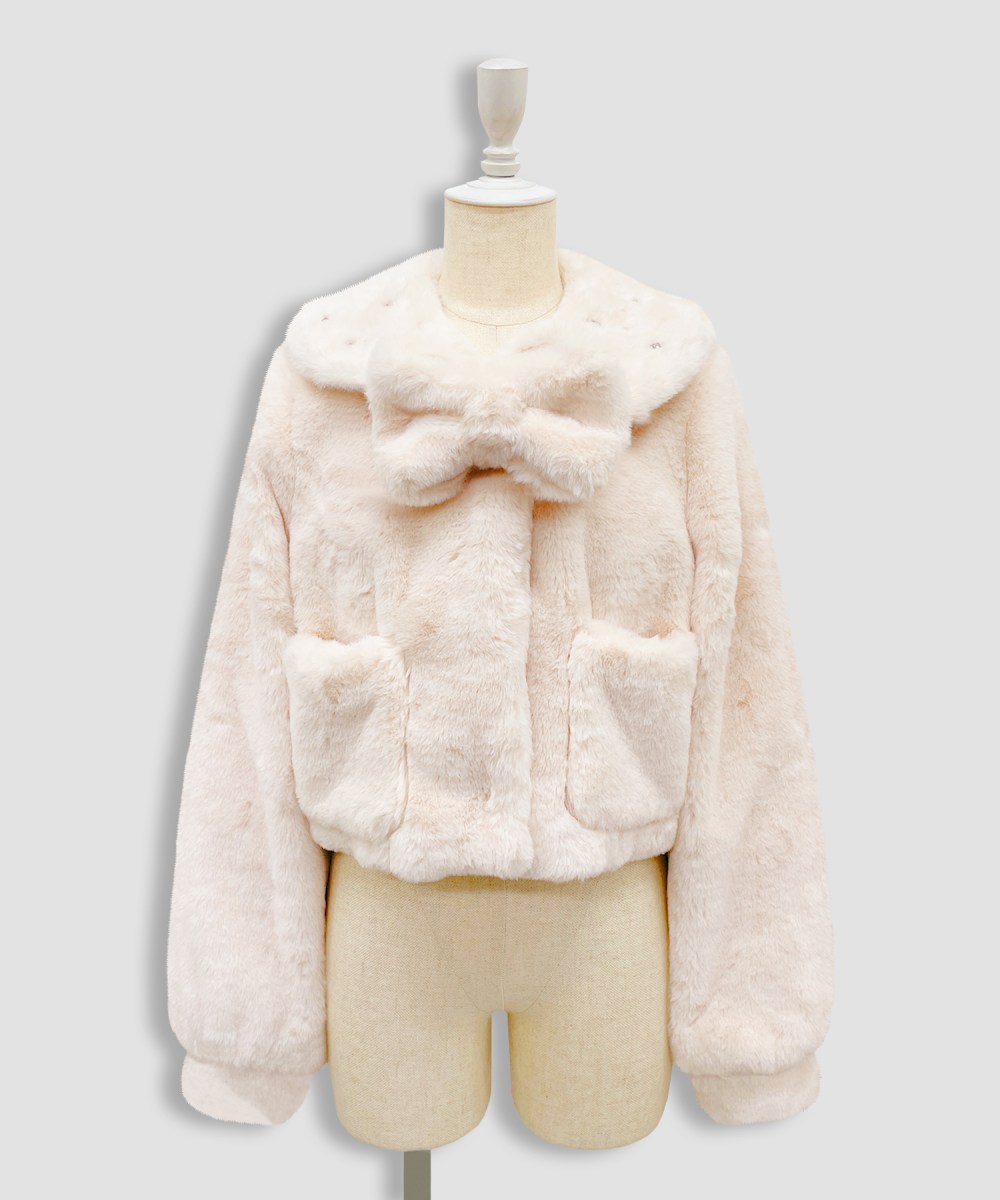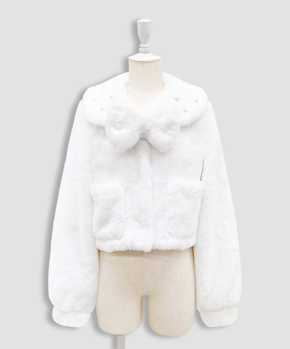 ビジュー付きの衿と存在感のあるファーのリボンがかわいいエコファーコート♡