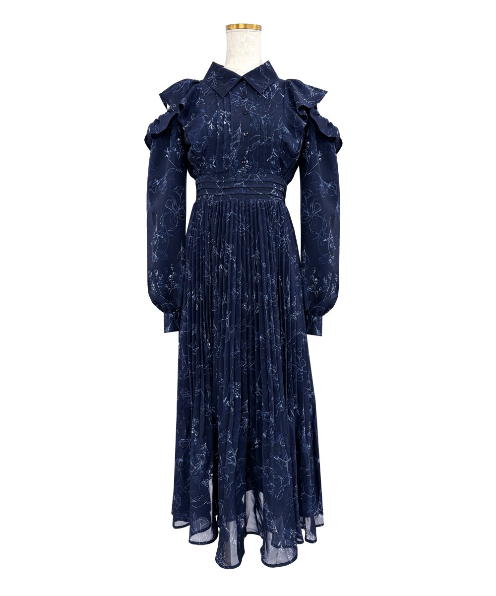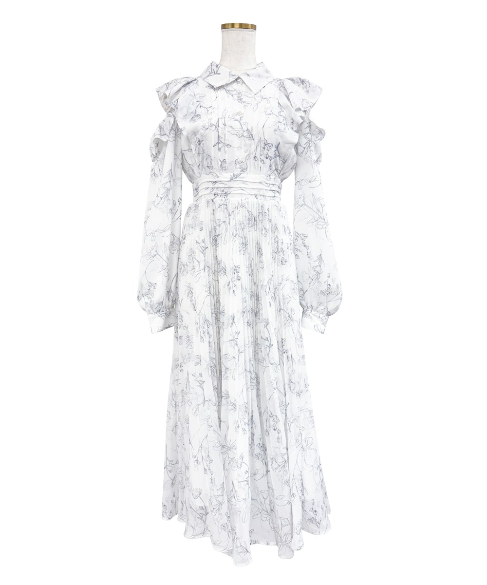 繊細なシフォン生地に、線で描いた花々がそっと咲くロングドレス。 クラシカルな襟元が上品さを添え、肩から流れるようにあしらわれたフリルと、肌をほんのり覗かせる肩開きデザインが、上品な抜け感を演出します。 ホワイトはスカートの裏地が2枚重ねになっており、透けの心配がございません。