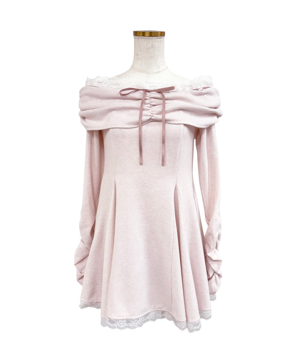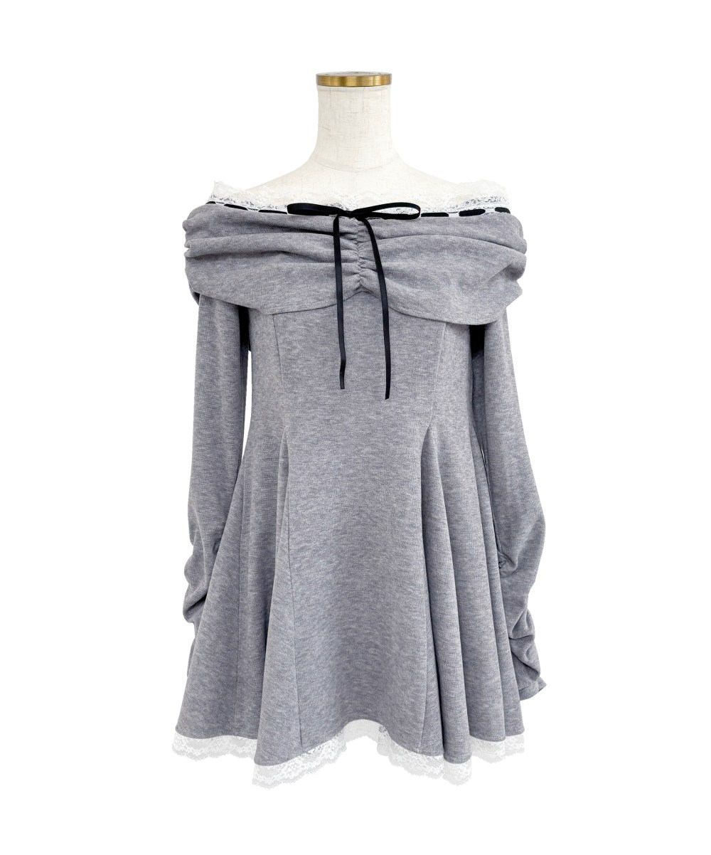 デコルテを綺麗に魅せるオフショルデザインは、抜け感がありながらも上品な印象に。
