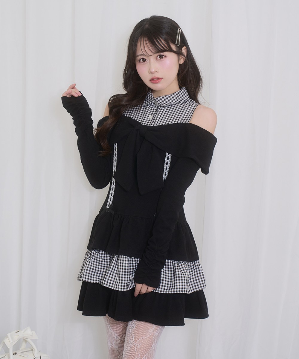 程よく肌見せしながら、フロントの大きなリボン見えのデザインやはしごレース、ティアードスカートでガーリーにまとめたアイテムです♡