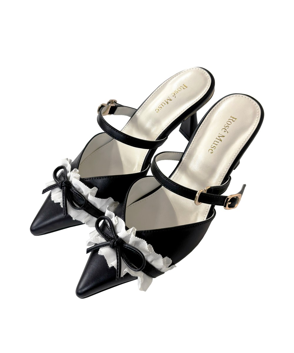 足先のリボンとバイカラーのフリルが華やかに見せてくれるミュール。 甲部分のVカットの空きやポイントのゴールド使いが上品な印象を演出してくれます。 ワンピースなどのフェミニンなスタイルにはもちろん、カジュアルなスタイルにも合わせやすいアイテムです。