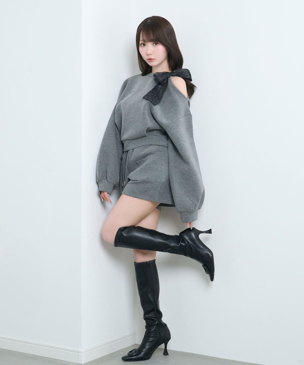 片側の肩をあけ、抜け感を演出してくれるスウェットとショートパンツのセットアップ。