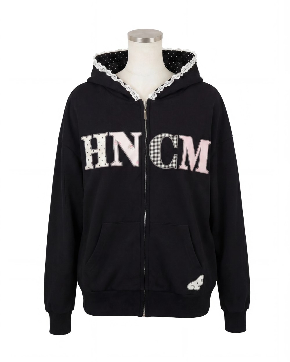 フード周りの小ぶりなレースがガーリーさをプラス、フード裏までドット生地を使用しハニーシナモンらしくまとめました◎
