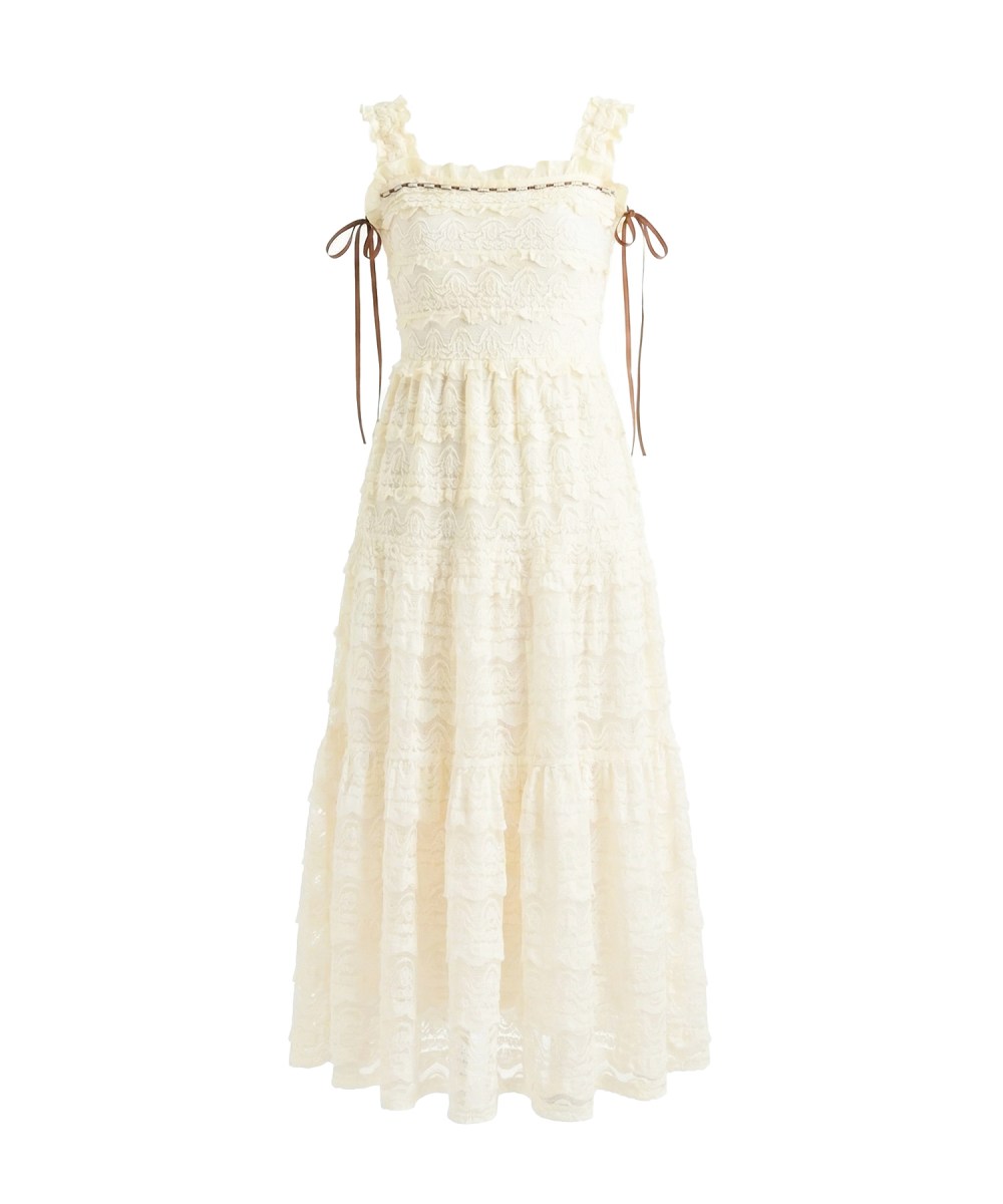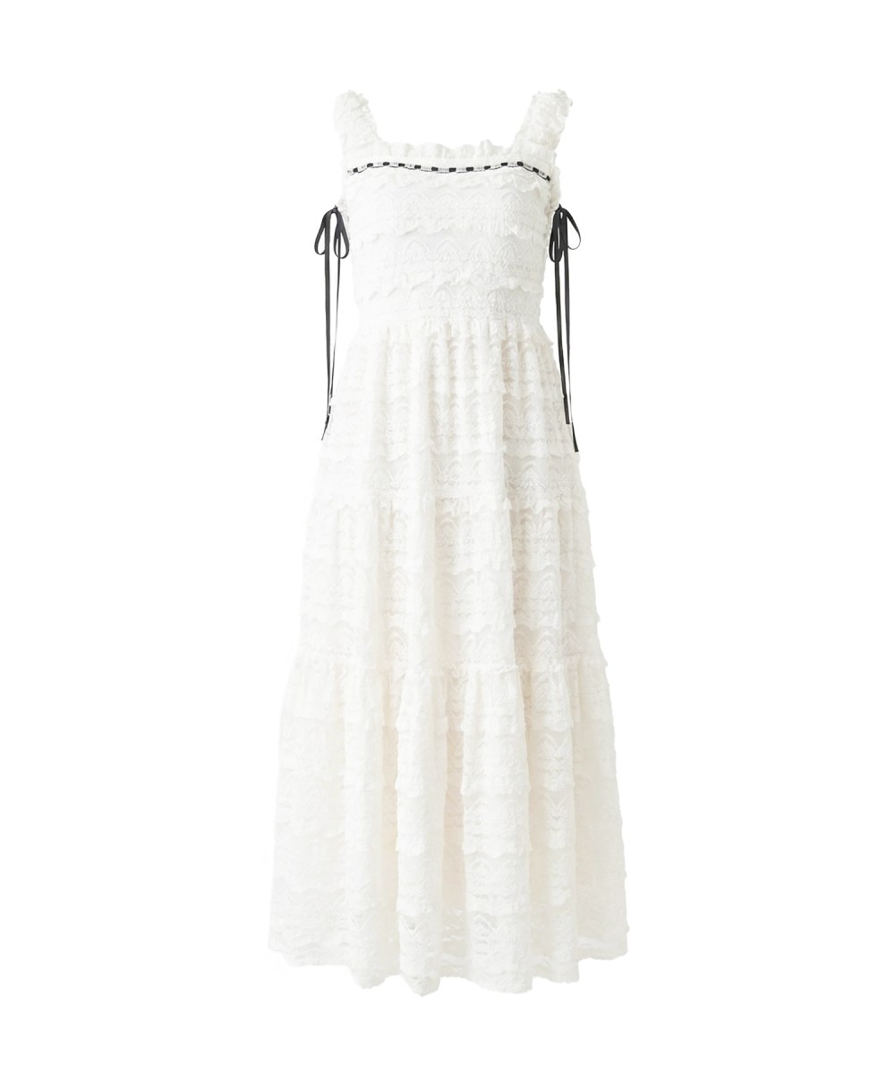 胸元にあしらったリボンと、レース生地が華蓮な印象を演出するワンピース。 伸縮性のあるレース生地を使用し、快適な着心地に仕上げました。